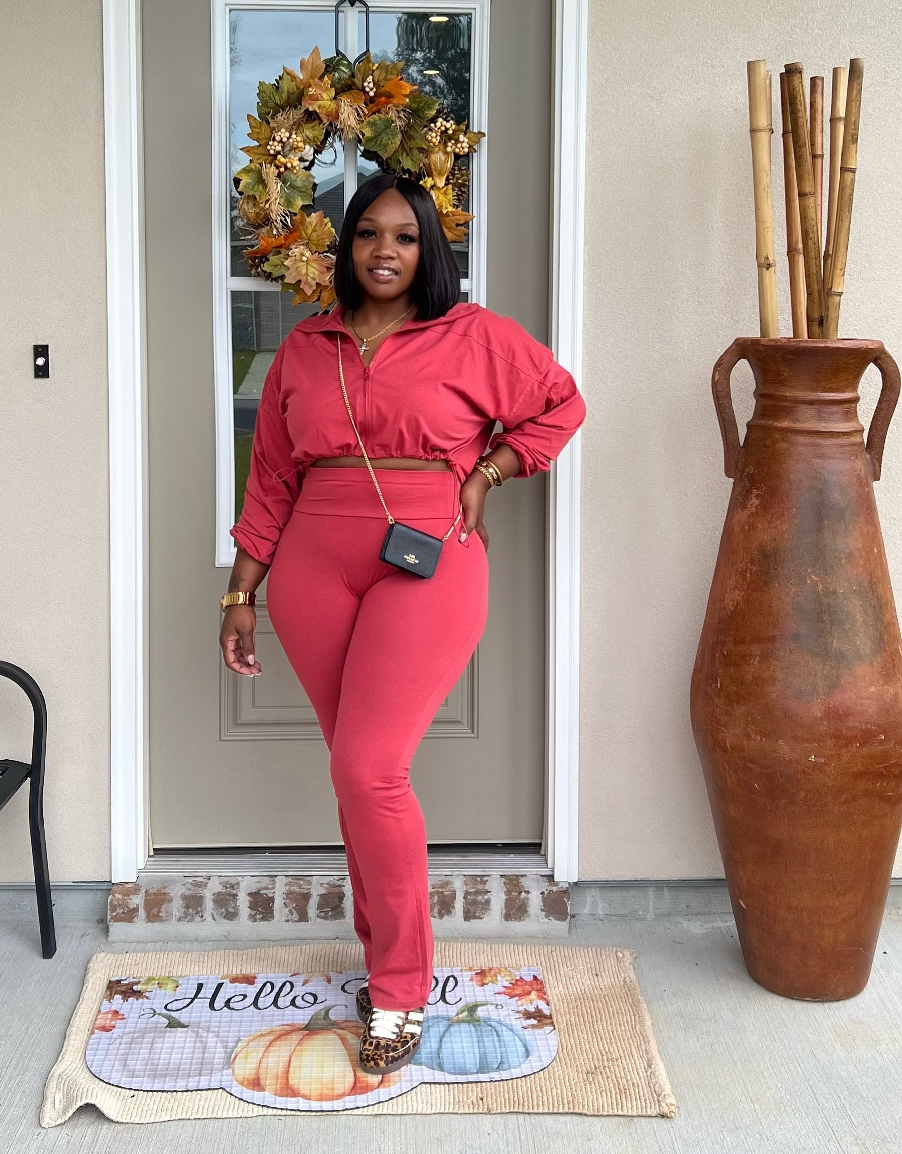 The Fall Thru Set features a crop jacket with a drawstring waist for a customizable fit. The zipper closure provides easy on and off wear. The matching high waist leggings are stretchy and tall girl friendly for a comfortable and flattering look.